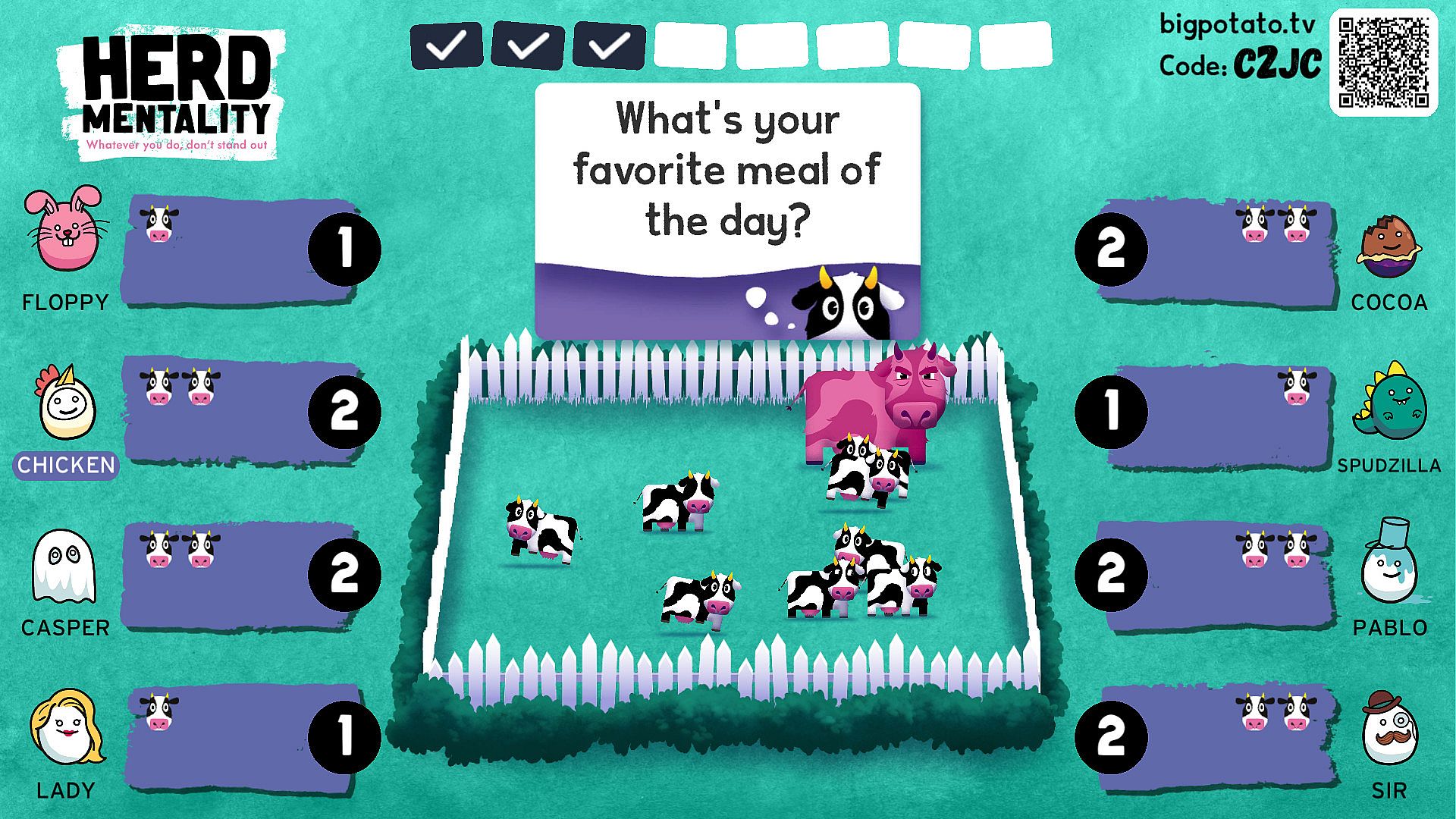 Herd Mentality: A `think like the herd` party game with one black and white mission — write down the same answer as everyone else. Watch out for the angry pink cow!