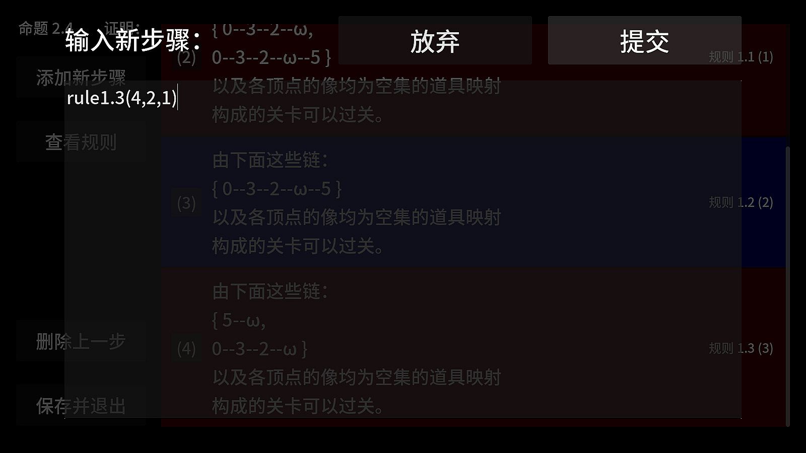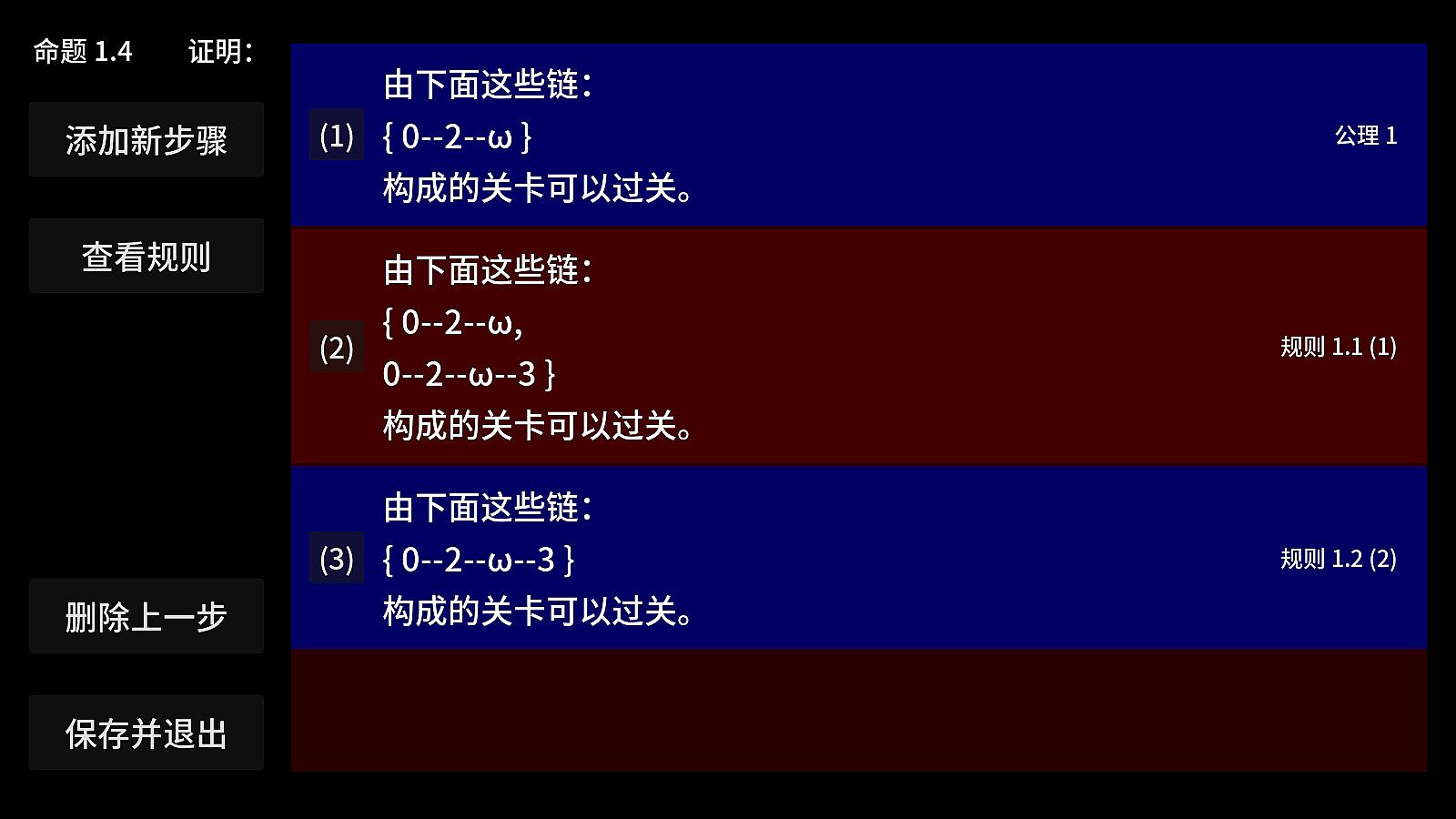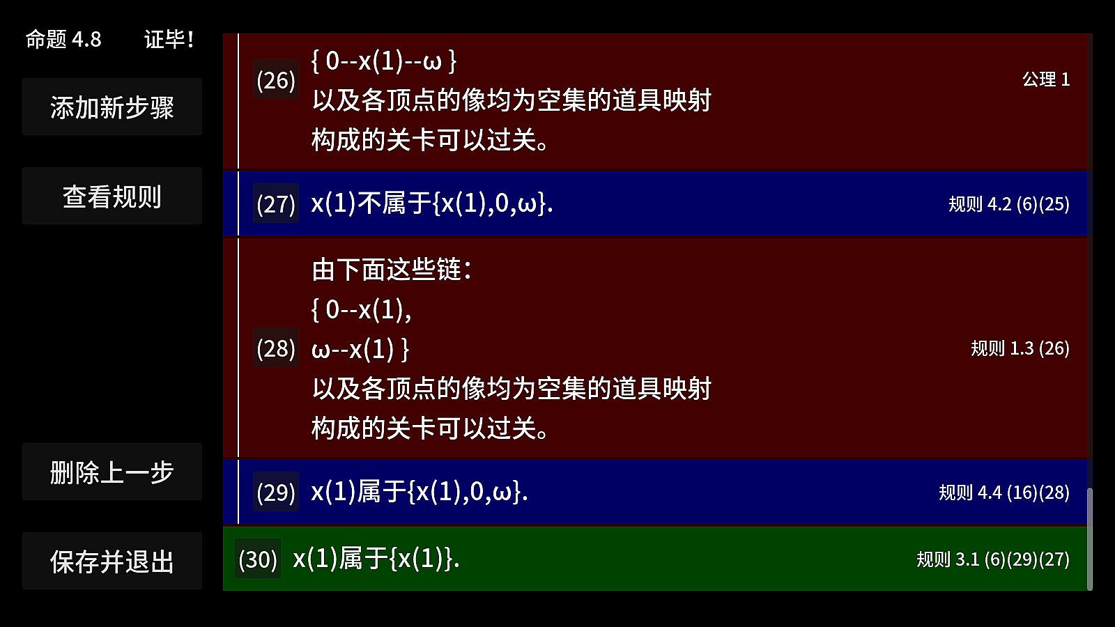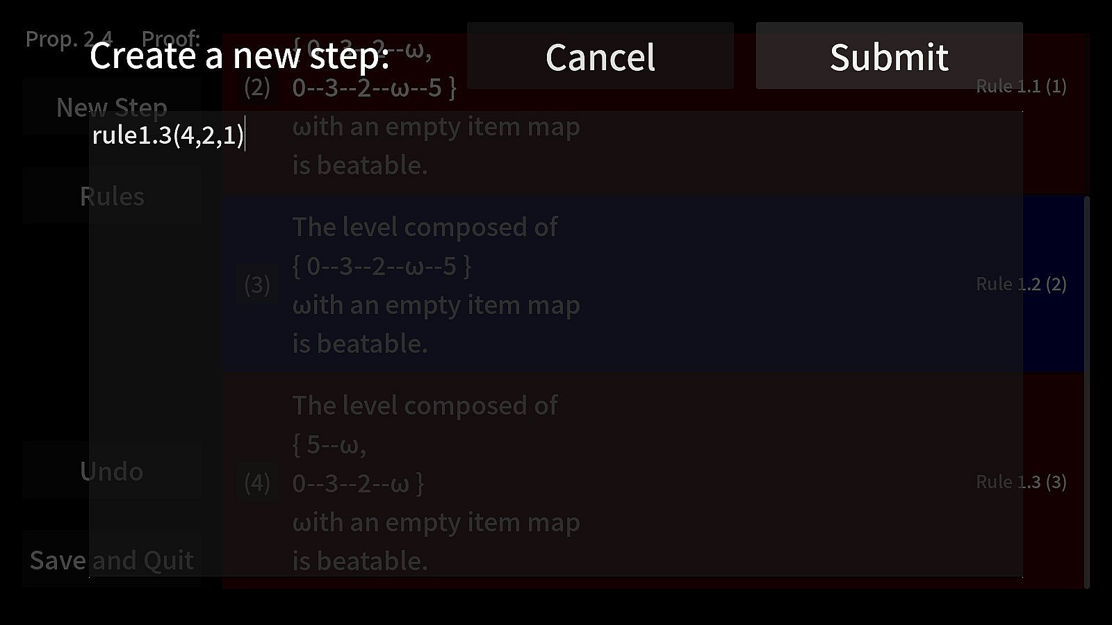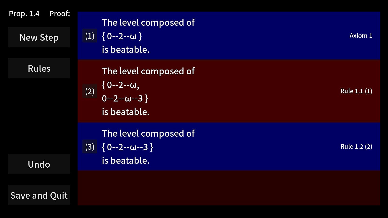 • The only way to create a new proof step is entering the right code, which is not the core of the game essentially. (It's due to my limited programming ability)