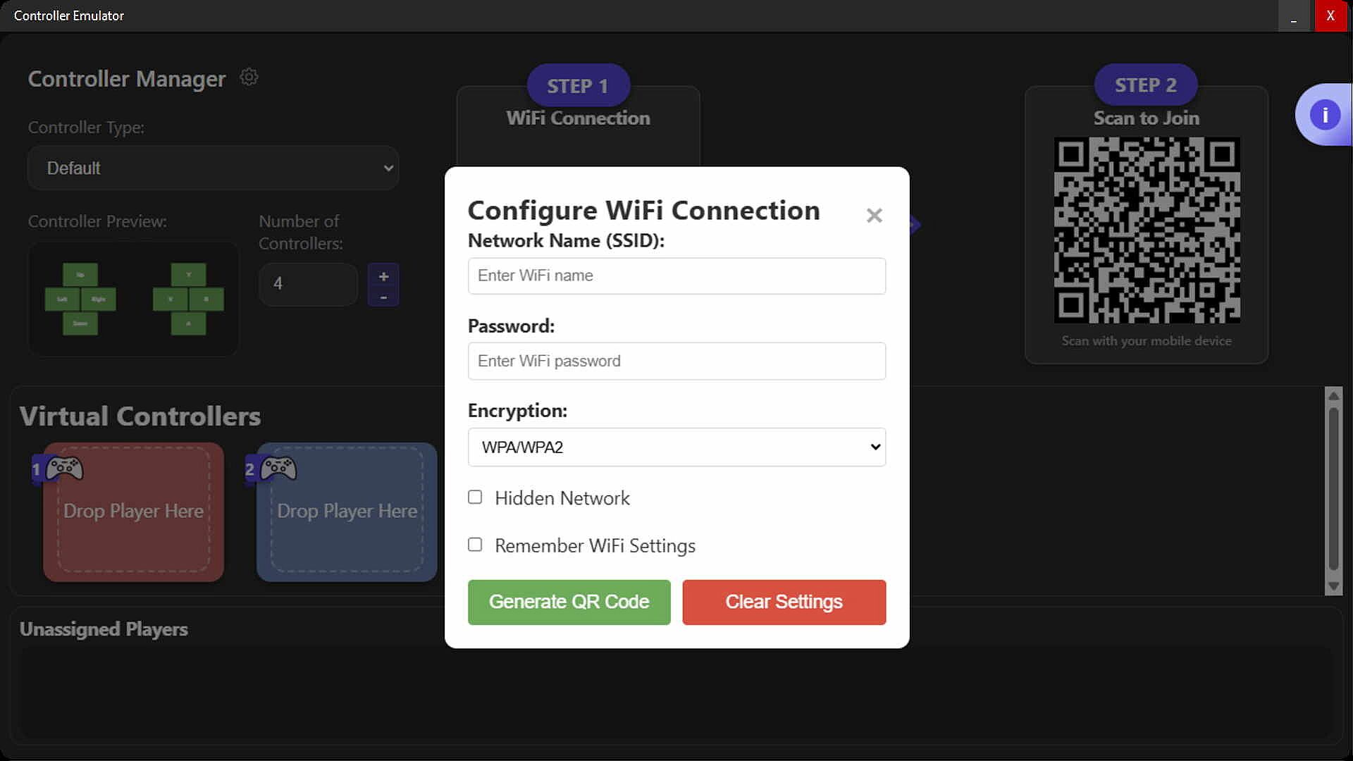 The application itself is an "Admin panel". That lets the user host control how many virtual controllers exist, and which connected players are assigned to which controllers.